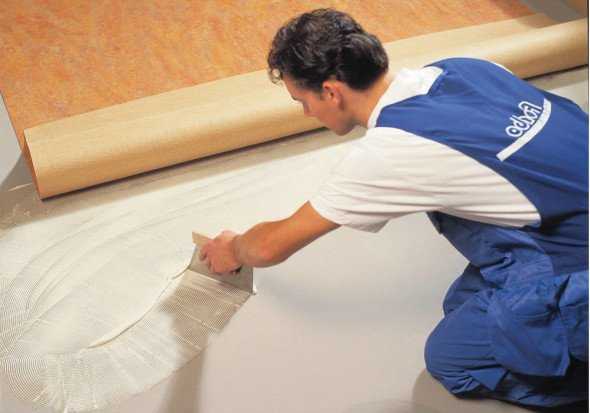 Далее необходимо равномерно нанести клей на всю тыльную (внутреннюю) поверхность линолеума. Для этих целей рекомендуется использовать зубчатый шпатель, который следует предварительно смочить водой. После этого где-то через 10 минут покрытие прикладывается к основанию пола и сильно прижимается.