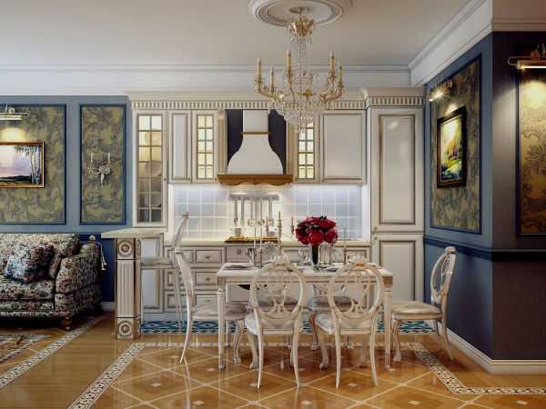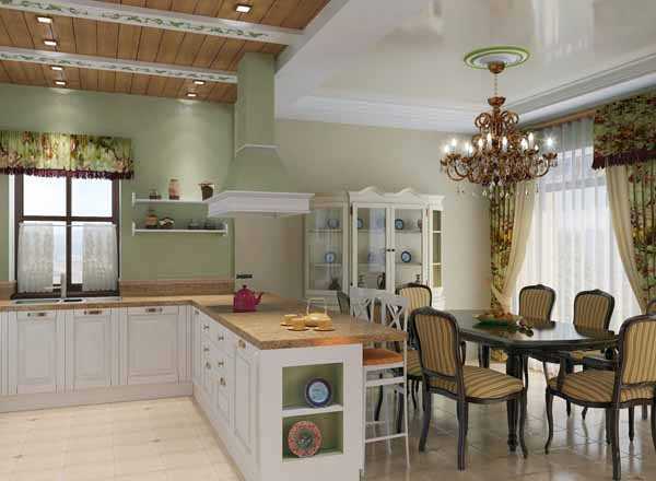 Обычно территория кухонной зоны небольшая, поэтому лучше будут смотреться светлые стены. Светлые тона визуально расширяют пространство. При выборе освещения для кухни вашего коттеджа часто используют точечное освещение, а для гостиной лучше подойдет красивая люстра или несколько разных источников света. Также для зонирования можно использовать разную высоту пола.