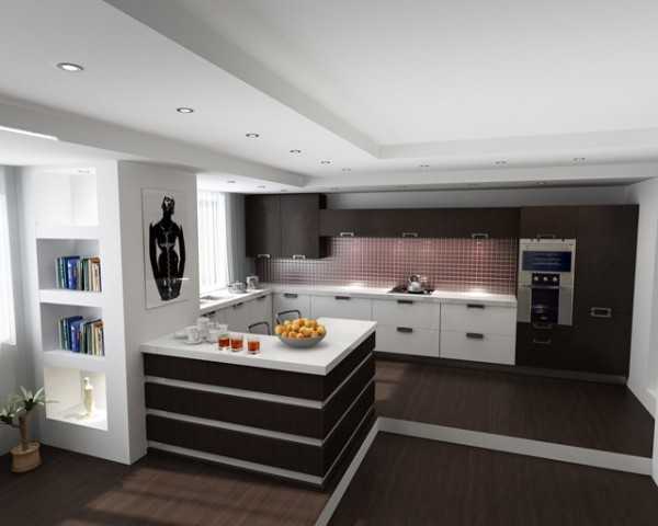 - Подиум. Всю зону кухни можно приподнять на подиуме, но в этом случае важно, чтобы в помещении были высокие потолки.