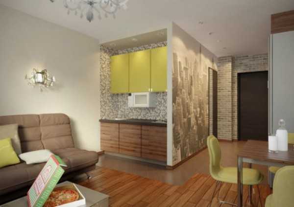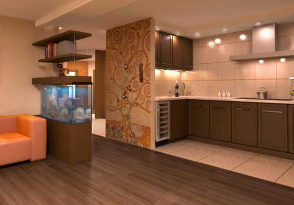 Визуальное разделение можно сделать с помощью разного пола в кухне и гостиной, цвета стен или же освещения. Так, в кухне чаще пол покрывают облицовочной плиткой, а в гостиной лучше положить ламинат, паркет, ковролин, доски, покрытые лаком.