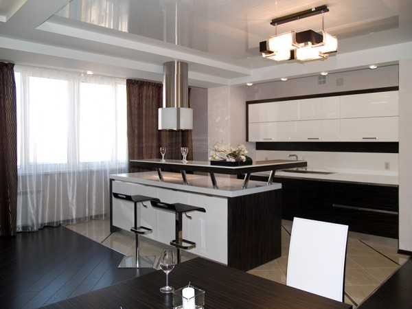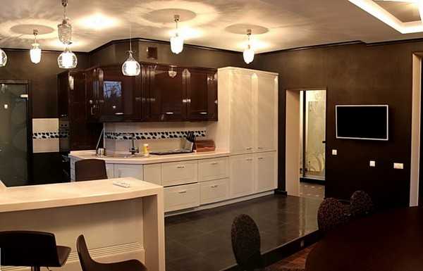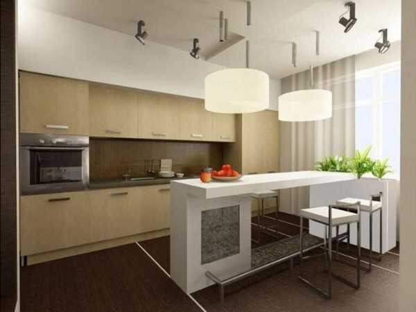 Если в кухонной зоне есть «остров» или отдельно стоящий прилавок барная стойка, придется делать светильники еще и над ними. Это могут быть потолочные варианты или спускающиеся с потолка на длинных шнурах. В некоторых вариантах дизайна кухни совмещенной с гостиной можно ставить классические люстры.