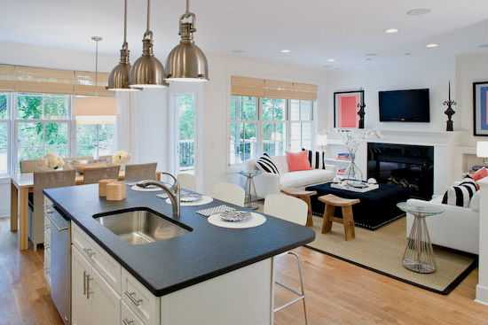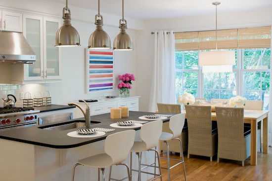 Интересных идей зонирования кухни и гостиной можно достичь с помощью правильного расположения мебели. Например, на месте стены, которая раньше разделяла помещения, можно установить большой обеденный стол. Таким образом вам удастся создать обособленную обеденную зону, которая одновременно будет выступать границей между кухней и гостиной. Чтобы подчеркнуть эффект разделения зон, над обеденным столом часто вешается ряд светильников .