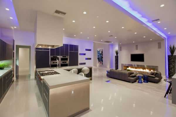 Так как объединены помещения с разным назначением, освещение в них тоже требуется разное. На кухне требуется чтобы рабочие поверхности были хорошо видны и свет нужен более резкий. В гостиной-столовой обстановка должна быть мягче. В идеале делают многоступенчатые системы, тогда, по желанию, свет делают ярким или приглушенным. Исходя из этих требований и разрабатывается схема освещения объединенных помещений.