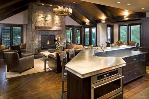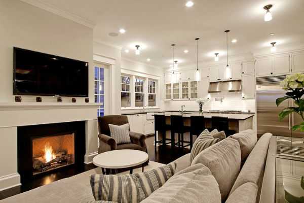 - В гостиной можно поместить большой телевизор, камин, диван и много другого, что поможет готовить и отдыхать одновременно.