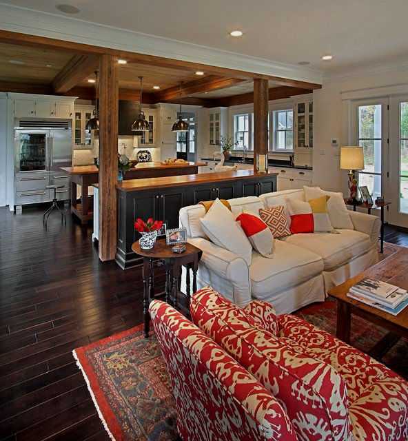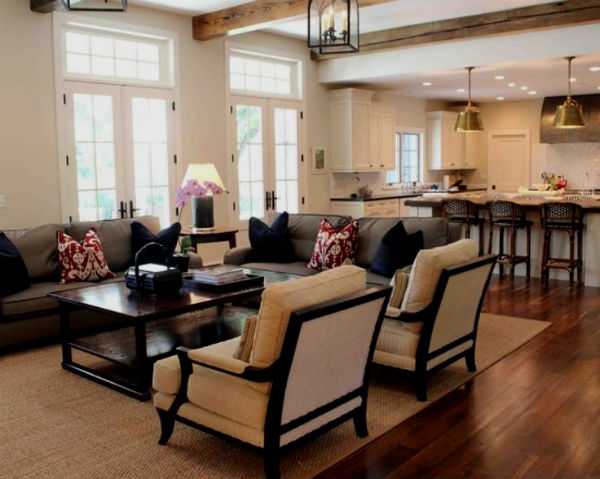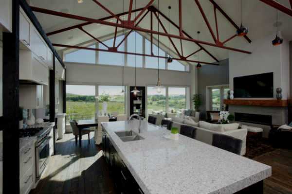 Следуя современным тенденциям дизайна интерьера, все чаще в оформлении внутреннего пространства загородных домов и коттеджей предпочитают соединение кухни и гостиной комнаты в одно помещение. Ведь что может быть лучше просторной, не ограниченной стенами и дверьми кухни, которая плавно переходит в жилую зону.