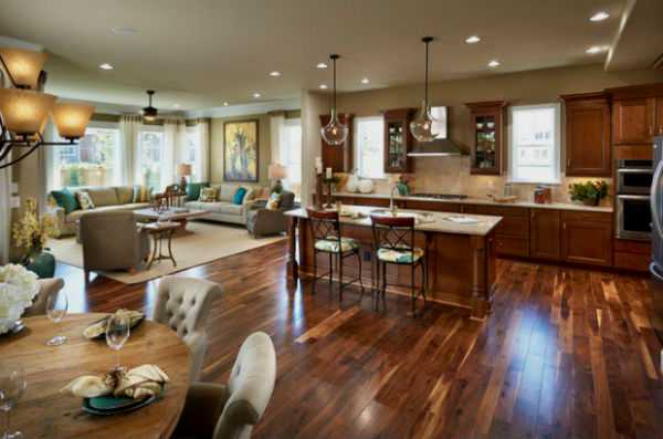 При выборе цветовой гаммы для кухни и гостиной загородного дома необходимо учитывать естественное освещение, которое проникает в помещения, стиль и цвет мебели, а также предназначение разных зон. Если вы хотите достигнуть эффекта единого пространства, тогда лучше всего не использовать очень контрастные и разные цвета.