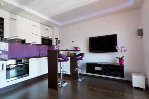 - Даже при наличии вытяжки часть запахов из зоны приготовления пищи будут попадать в гостевую зону. Но даже это не всегда можно считать недостатком, ведь в наличии вкусных ароматов нет ничего плохого.
