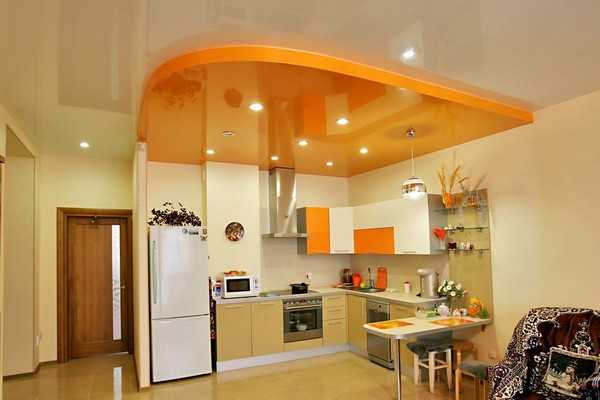 Еще одним интересным способом зонирования кухни и гостиной является создание подиума или декоративных навесных конструкций. Однако эти приемы хорошо смотрятся только в помещениях с высокими потолками.