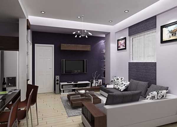- Кроме того в таком помещении можно создать три так называемые визуальные зоны: гостиную, кухню и столовую. То есть для приема пищи можно использовать зону столовой, из которой в два шага можно оказаться на кухне и взять необходимые предметы, а также смотреть телевизор, расположенный в зоне гостиной.