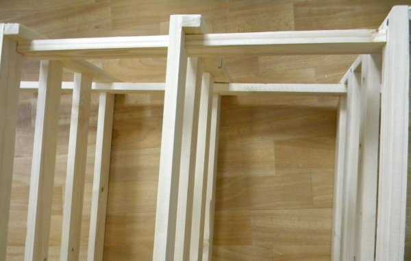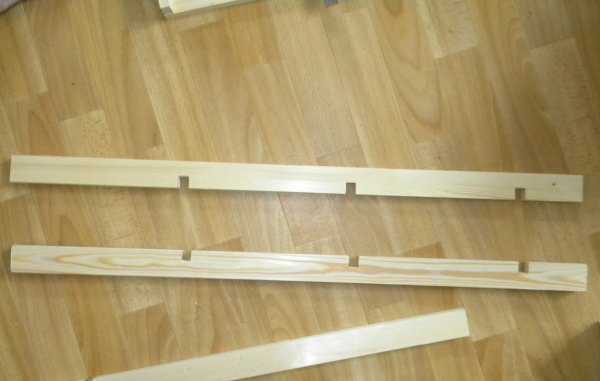 Пилим рейки на заданные отрезки. Для четырехъярусной конструкции нужно заготовить: