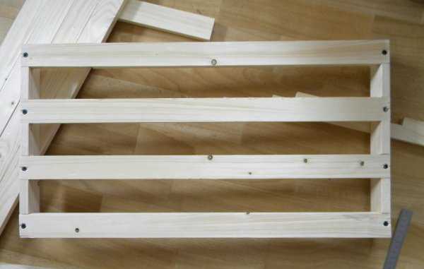Собрав боковые стойки, вы должны получить две лесенки. К их «ступенькам» и будут крепиться рейки ярусов. Начинать собирать их нужно снизу вверх.