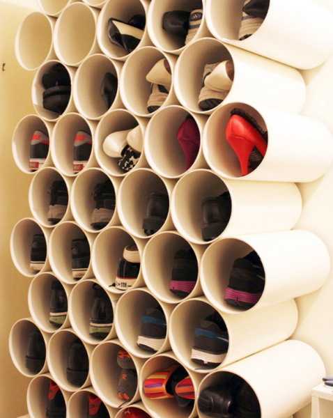 Если вы думаете, что это речь пойдет о металлической полке для обуви, то очень ошибаетесь. Собирать ее будем из труб ПВХ диаметром 20-25 см. Распилить на цилиндры материал можно ножовкой. Для декора подойдет краска или самоклеющаяся пленка. Собрать отдельные элементы воедино поможет клей.