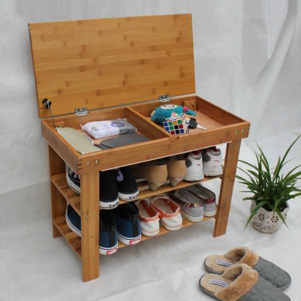 Деревянным обувницам можно придавать самые разнообразные формы. Хорошо будут смотреться и угловые варианты, и полки в виде скамьи.