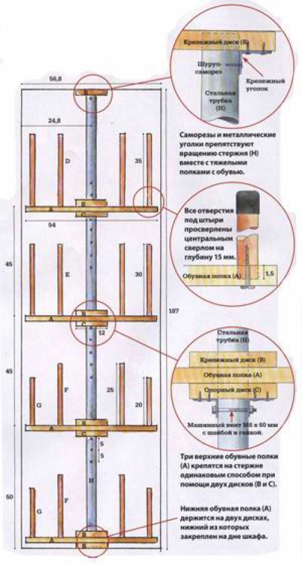 В шкафу закрепляем неподвижно металлическую трубу, а на неё уже устанавливаем вращающиеся круглые полки для обуви. В эти круглые полки для обуви вставляем штыри, на которых, собственного говоря, и будет располагаться наша обувь.