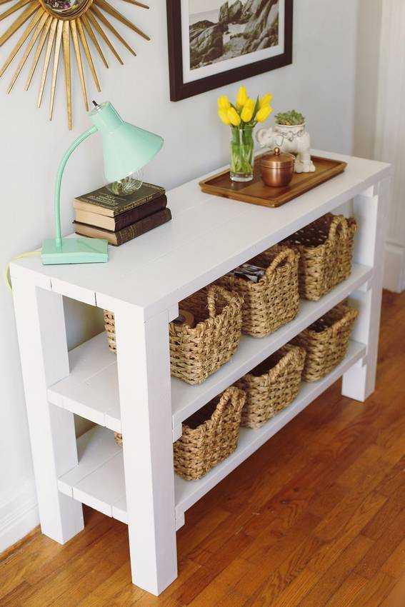 Собрать такую конструкцию новичкам предлагают из брусков и реек. Не поленитесь составить чертеж будущего изделия, чтобы по нему аккуратно распилить материалы. Не беда, если в доме не нашлось нескольких брусков. Полку под обувь своими руками можно сконструировать и из одних реек. Кроме них нужно будет приготовить мебельный лак, наждачную бумагу, саморезы. Из инструментов понадобится шуруповерт и ножовка.