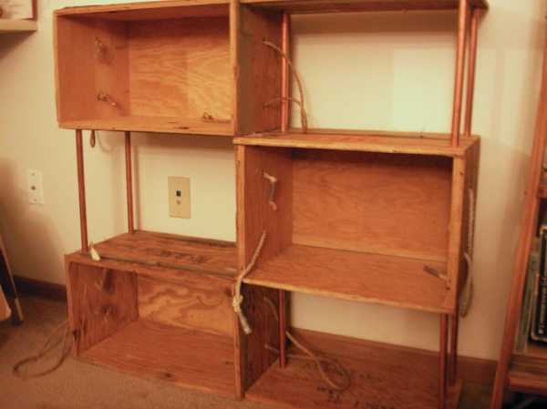 Вам только остается решить, каким образом их поскладывать. Если в доме есть маленькие дети, конструкцию, конечно, необходимо соединить болтами или саморезами, а еще лучше, прикрепить к стенке, так будет надежней и безопасней. Но если детей нет, то скреплять нет необходимости, ящики достаточно прочные. И основное преимущество, вы сможете менять форму конструкции хоть каждый день. Представляете, каждый день у вас новая полка и никаких гвоздей