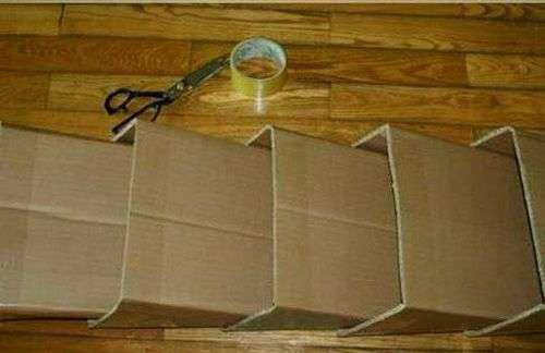 - когда вы обрежете большие коробки, как показано на картинках, то из этих обрезков можно сделать дополнительные полочки для мелких предметов внутри полок, для этого просто следует сделать в обрезка разрезы и соединить обрезки решеткой.