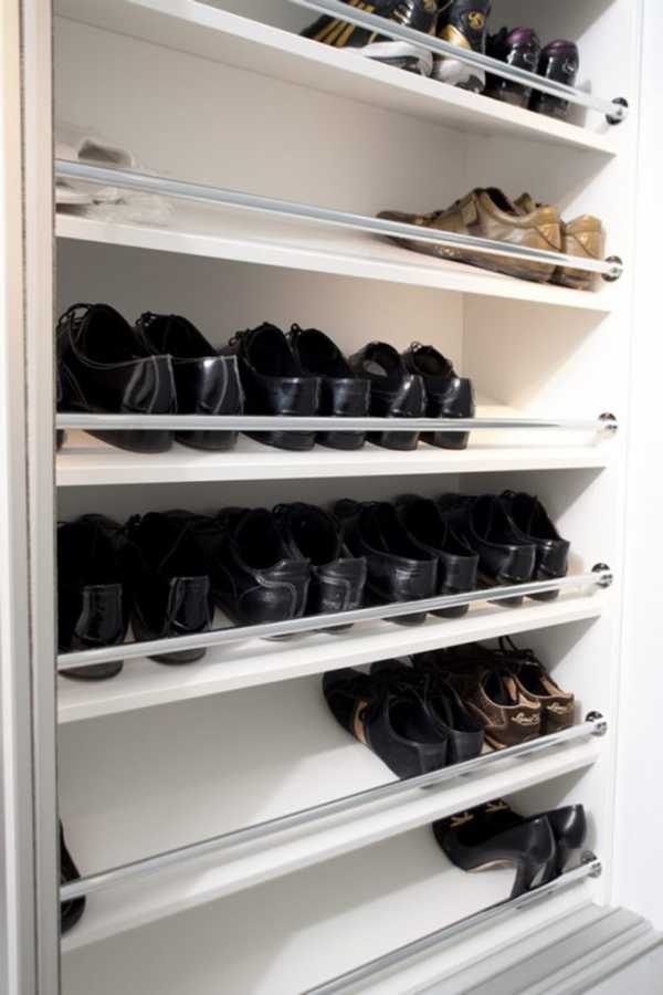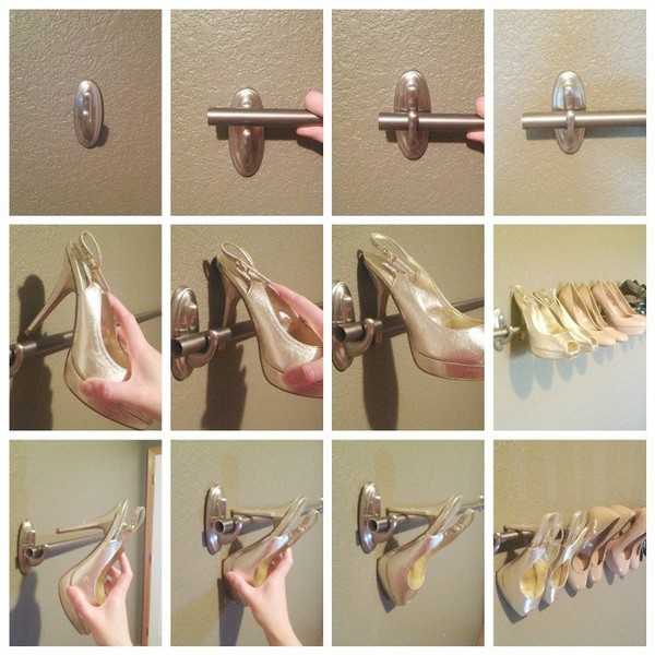 При планировании интерьера прихожих чаще всего встает одна проблема – не хватает пространства. Чтобы немного сэкономить места, можно пойти на разные ухищрения, вот например один из способов, правда только для дамской обуви на тонких каблуках. Эту особенность женской обуви можно использовать. На расстоянии 5 сантиметров прикрепите к стене длинный поручень и обувь будет держаться исключительно за счет каблука.