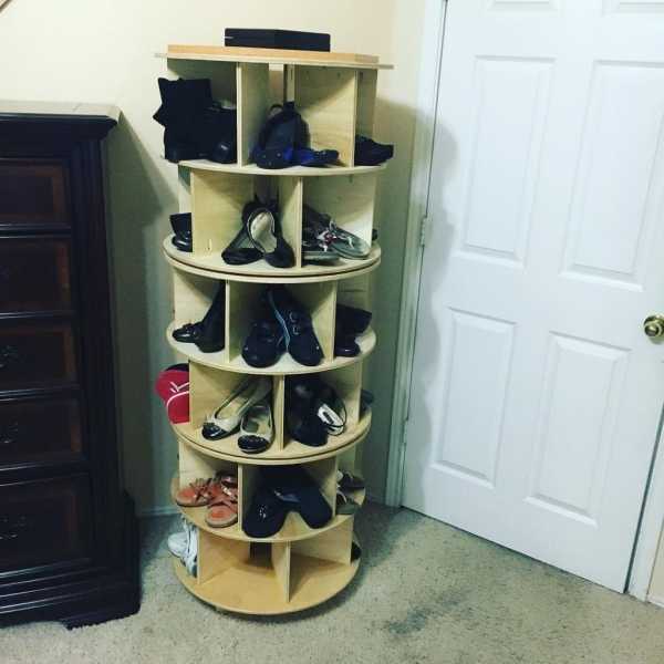 При наличии определенных навыков и желания, ярусы круглой обувницы можно сделать вращающимися. Это сделает ее использование максимально комфортным.