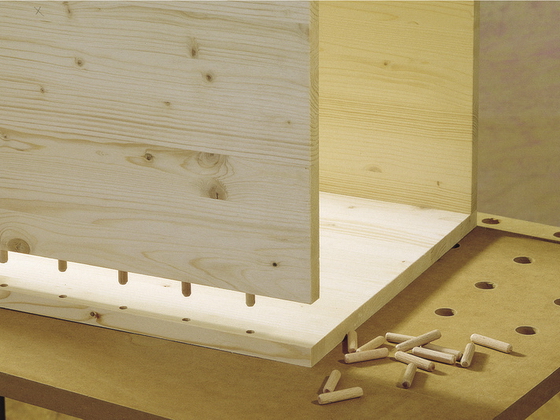 16 … приглушенный дюбелями 010 мм, специально купленный для этой цели. Части дюбелей, выступающие над поверхностью боковых кромок, полируются на одном уровне с кромками. Теперь полки никуда не денутся.