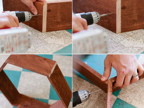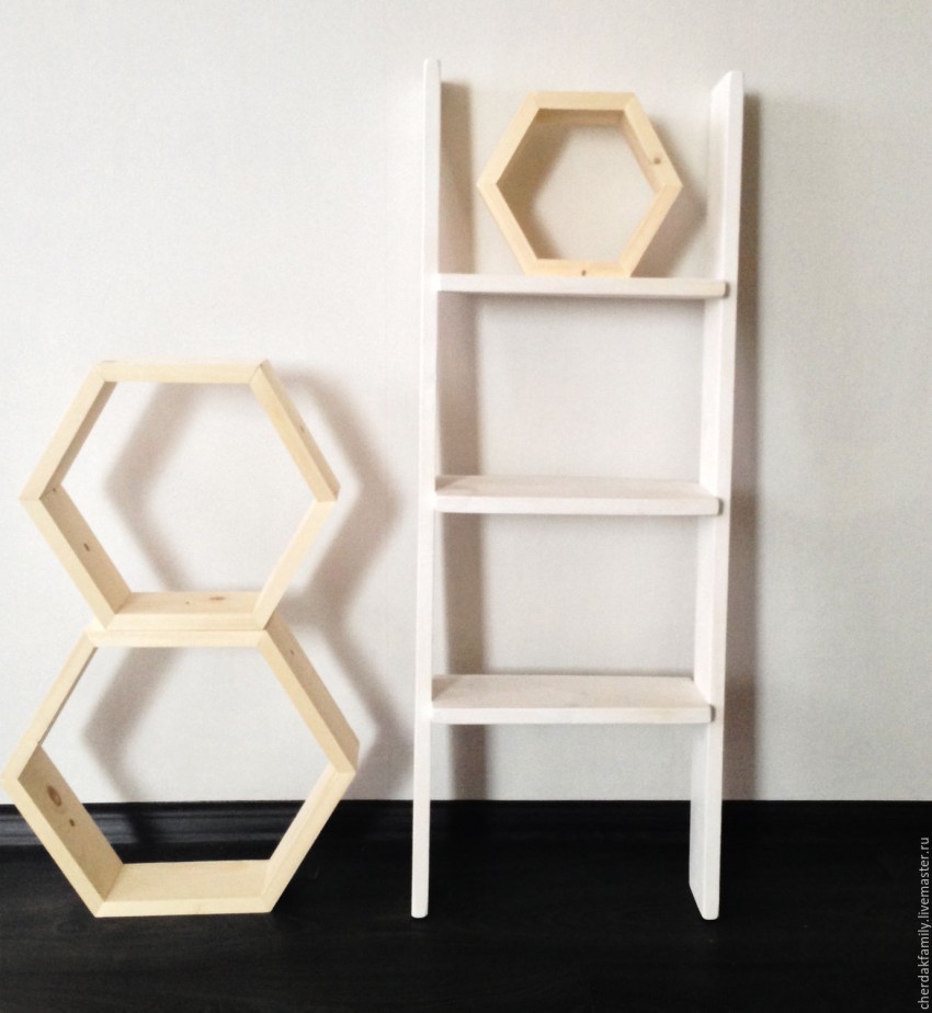 Каждый шестигранник изготавливают отдельно, красят, покрывают лаком. Затем крепят на стене, формируя из них модуль. Полка такого типа выглядит весьма интересно.