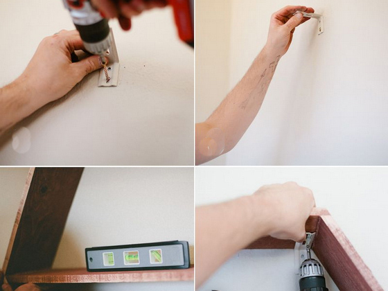 6. Наконец, полка крепится к стене с помощью шурупов и дюбелей под углом 30 °. Наклон обеспечивает стабильное положение книг.