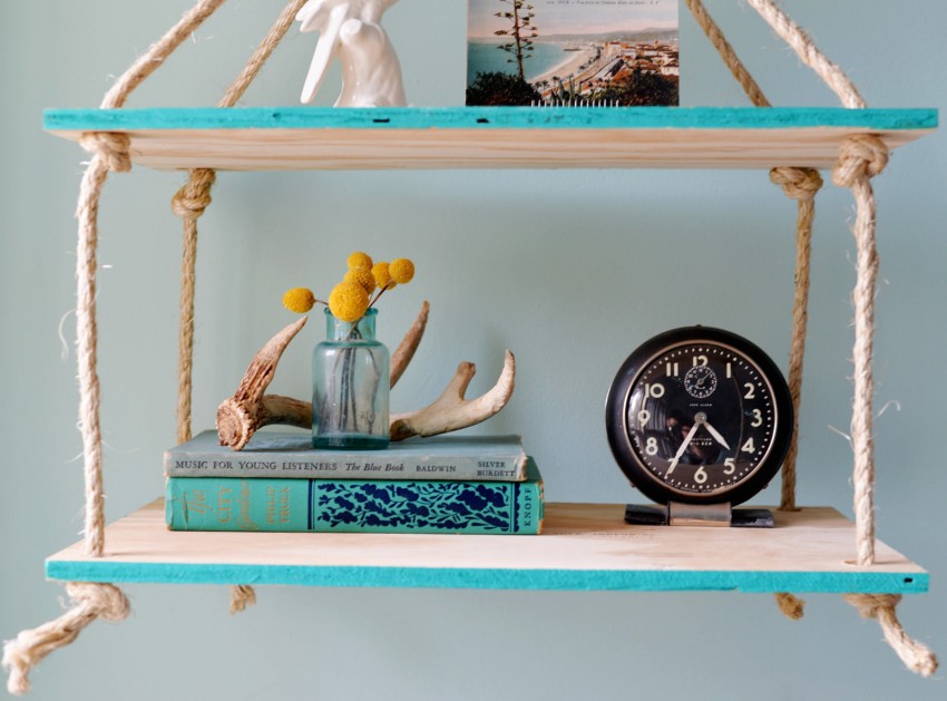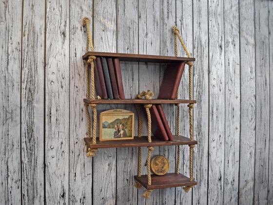 Несложно смастерить своими руками полочку подвесной конструкции, по виду напоминающую винтажную этажерку.