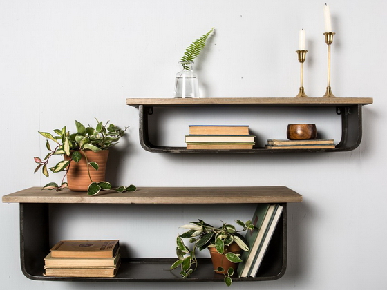Из этого материала получаются оригинальные и долговечные конструкции, но подобные полки сложнее вписать в интерьер обычного жилища. Кроме того, в силу особенностей металла изделию требуется обязательная обработка поверхности во избежание коррозии и помещение, где нет повышенной влажности.