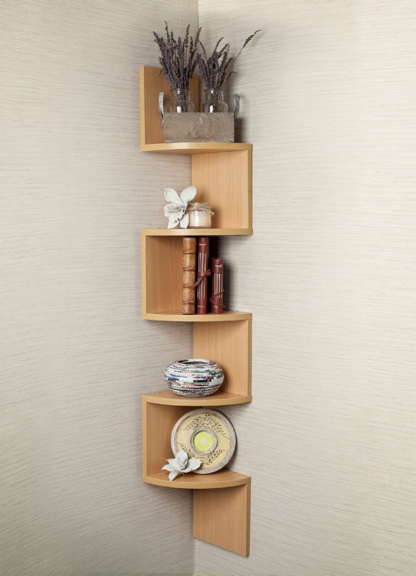 Для оформления выступающего внешнего угла хорошо подойдет простая конструкция из нескольких небольших открытых полочек, расположенных с небольшим смещением относительно друг друга.