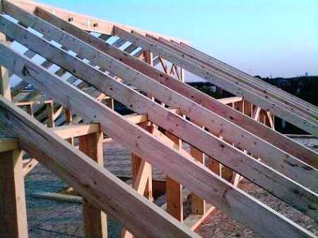 - Отличается сложностью процесс монтажа крыши. Сначала изготавливаются стропила. К простым решениям следует отнести установку односкатной кровли или плоской крыши, последние по своим эксплуатационным характеристикам не уступают, а в чем то и лучше обычных «скворечников» (по этому вопросу много споров среди профессиональных строителей, по части снеговой нагрузки например, протекания, но тут очень многое зависит от технологии, пирога крыши, региона). Затем монтируется обрешетка, крыша покрывается кровельными элементами.