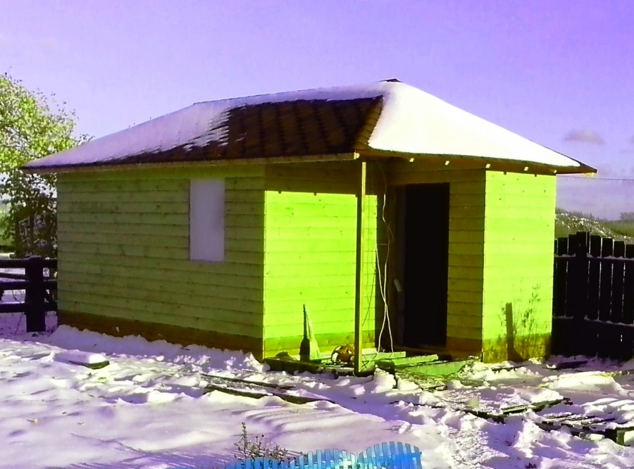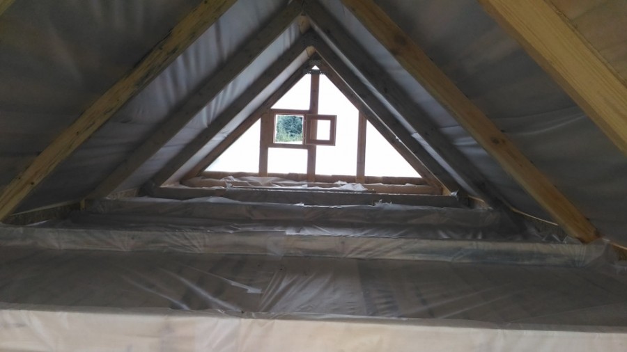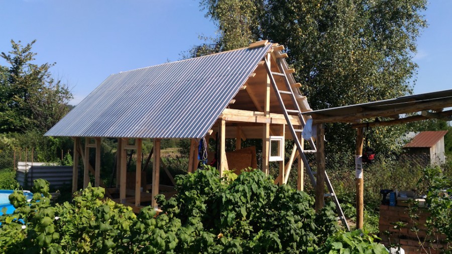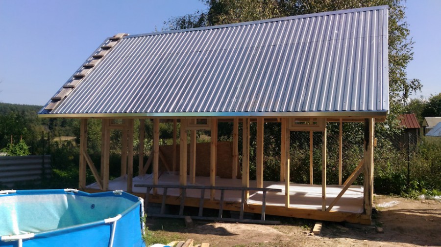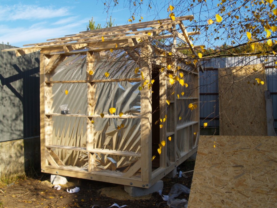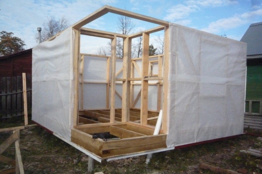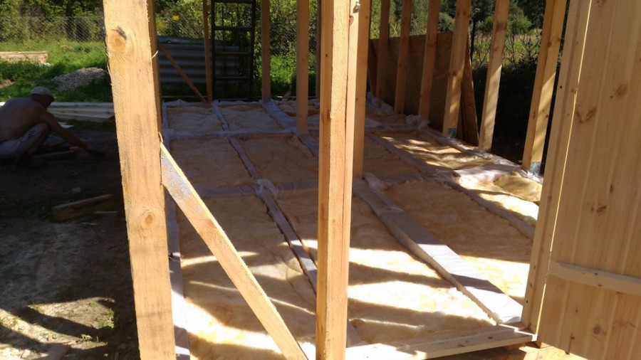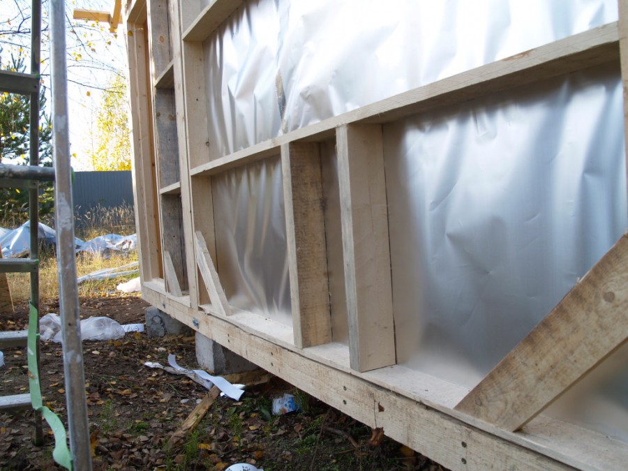 Фото строительства мойки.Фольгированным слоем или полиэтиленом необходимо закрыть не только утеплитель, но также каркас бани. Поэтому фольгу крепят поверх каркасных балок, закрывая при этом как утеплитель, так и деревянные опоры строения. Для крепления утеплителя используют степлер, поверх скоб плёнку придавливают деревянными планками.
