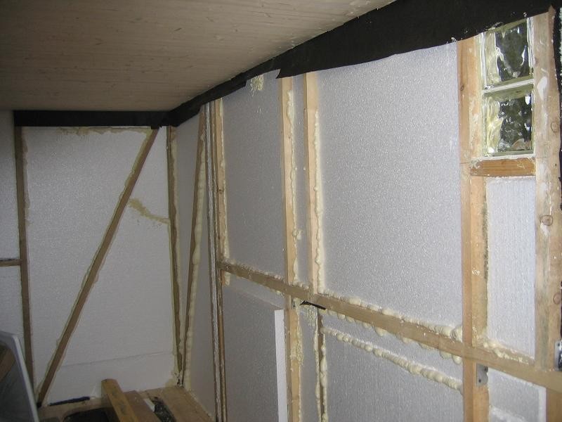 Пошаговая инструкция строительства каркасной бани запрещает использование пенопластовых плит для теплоизоляции стен парной комнаты по причине большого количества синтетических испарений, а также из-за возможности их оплавления при нагреве. Пенопласт можно использовать для теплоизоляции стен комнаты отдыха и душевой.