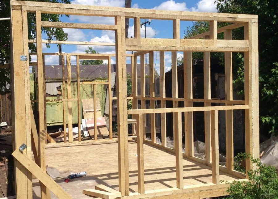 Видео с пошаговым строительством каркасной бани руками хозяев демонстрирует процесс сборки каркасных стен.
