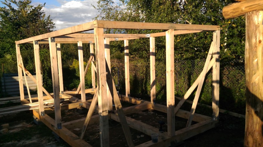 - Заканчиваем верхней обвязкой и постоянными укосинами для жесткости .