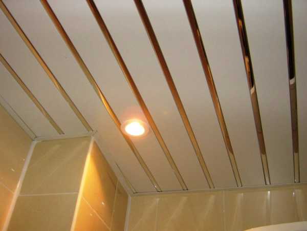 На фото белая реечная подвесная конструкция с золотистыми вставками.