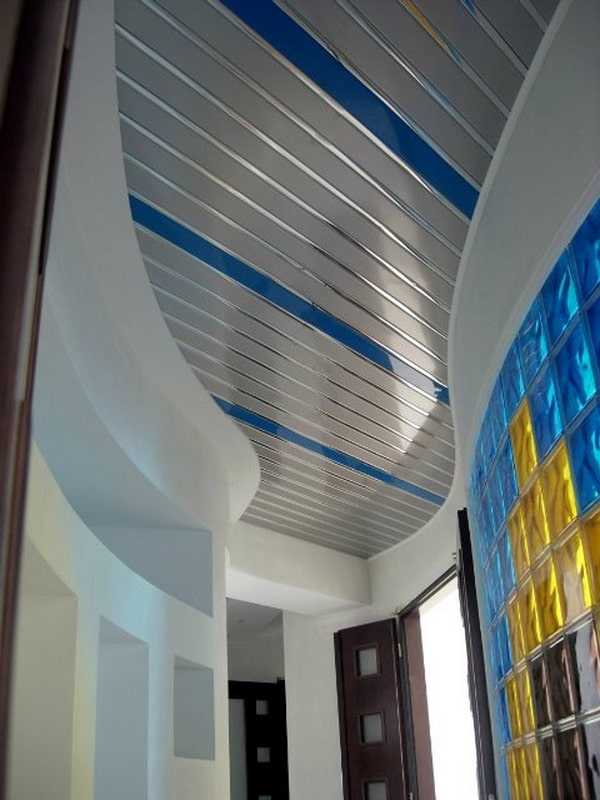 Многие мастера при монтаже реечного потолка укладывают панели «елочкой» – смотрится оригинально и красиво. А если к этому еще добавить и разный по цвету материал, то получается очень интересный эффект.