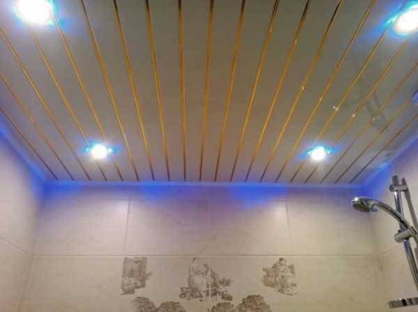 - прежде чем монтировать новый потолок в ванной комнате, в нем следует предусмотреть точечное освещение. Для того чтобы это сделать, в панелях необходимо просверлить отверстия, необходимого диаметра, после чего вставить светильник. Панель прикрепить к базовому потолку и подключить осветительный прибор.