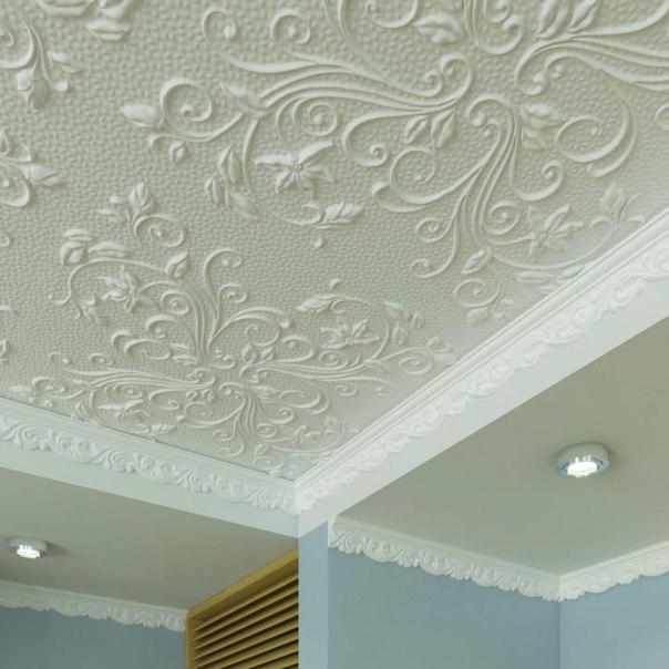 Необходимым дополнением к такому потолку служат декоративные плинтуса, которыми закрываются стыки и неровности. При желании, на них можно смонтировать светодиодную ленту для подсветки. Чтобы пенопласт не блестел, после монтажа его окрашивают водоэмульсионными или акриловыми красками.