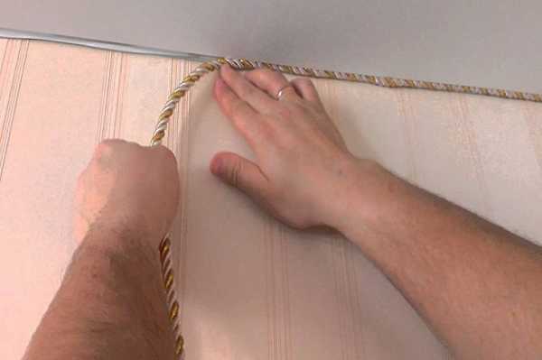 Приобрести красивую веревку необходимого диаметра (оптимально 10–12 мм) можно в любом магазине штор или материалов для шитья, а затем остается только «вдавить» ее шпателем в зазор и подклеить термопистолетом в местах сгибов.