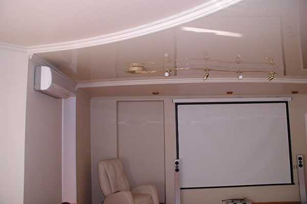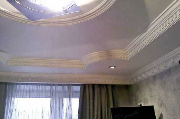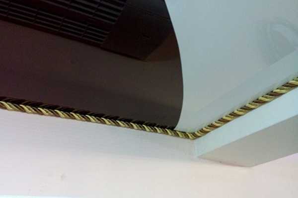 - Если стены не слишком ровные или имеются скруглённые участки, под натяжной потолок устанавливают гибкий полиуретановый молдинг.