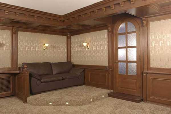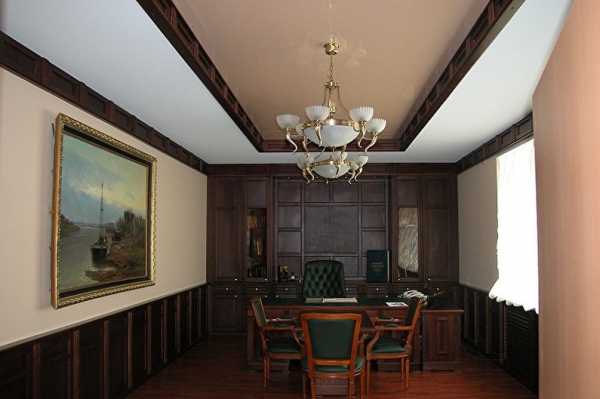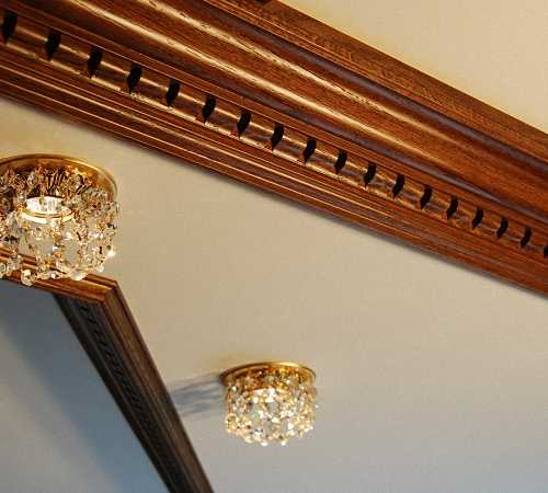 Если выбран сдержанный английский стиль, присущий кабинетам, библиотекам и гостевым залам, рекомендуется использовать карниз с фактурой красного дерева, покрытого лаком. На нем может быть имитация резьбы, золотые вставки – главное, чтобы все вместе напоминало богатый салон конца ХІХ – начала ХХ века.