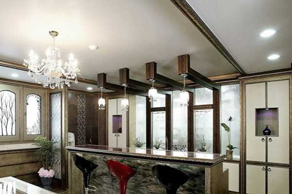 Хотя в этнических и деревенских направлениях дизайна натяжной потолок скорее исключение, чем правило, его матовые или тканевые варианты по периметру можно дополнить плинтусами из дерева либо полимерной имитацией доступных пород – сосны, ясеня, ольхи и т. п.