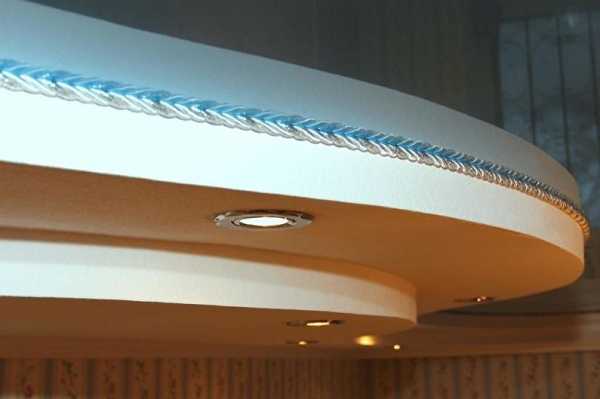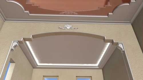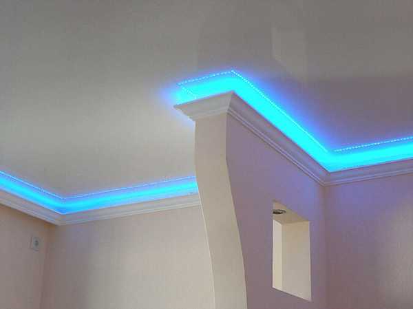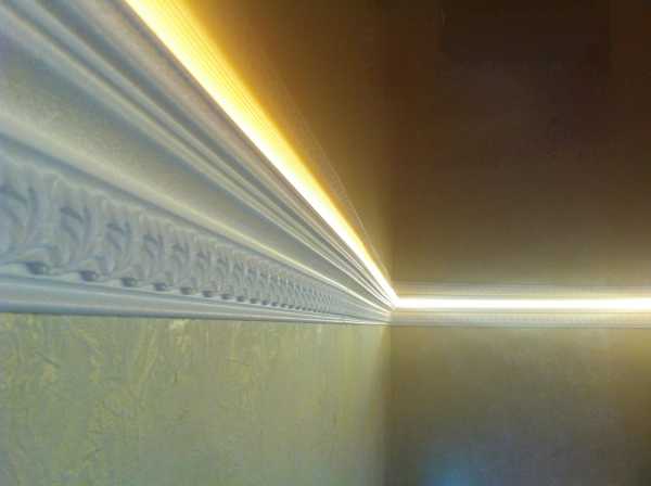 - Иногда по периметру потолка монтируют скрытую подсветку из светодиодной ленты. Тогда берут галтели с широкой горизонтальной частью. На некоторых изделиях даже есть отражающая полоса из фольги, усиливающей свет.