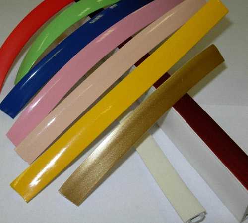 Гибкую декоративную вставку подбирают под основной материал. Выпускают в тех же цветах и фактурах, что и поверхность полотна. В результате стык получается практически незаметным.