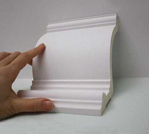 Прочным считается плинтус из полиуретана. Его главным достоинством является гибкость, что позволяет обходить круглые элементы комнаты плавно, не испортив внешнего вида кромки между потолком и стеной.