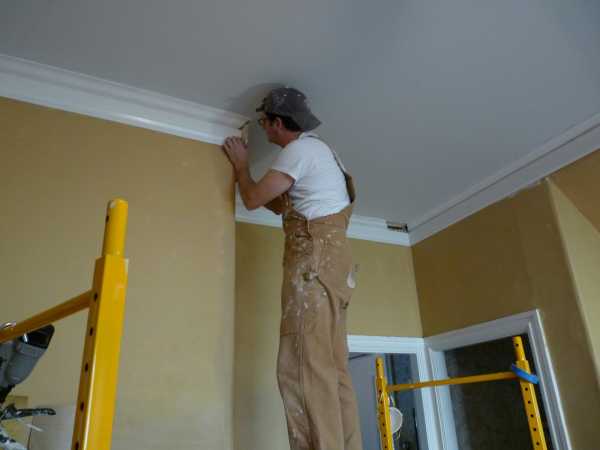 - Образовавшиеся щели между стеной и декоративным элементом потолка замазываете акриловой шпаклевкой.