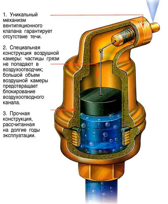 Конструкции автоматических воздухоотводчиков могут быть различными, но принцип действия у них одинаковый. В корпусе имеется полое отделение с поплавком из пластмассы. Он при помощи флажка надавливает на шток с пружиной, доступ к атмосфере открывается, воздух выходит. Когда полость заполняется теплоносителем, поплавок надавливает на шток, закрывая отверстие, предотвращая выход воды.