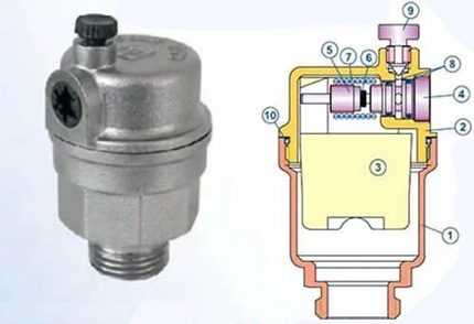 - на корпусе есть полое отверстие с пластмассовым поплавком. Он надавливает на шток, оснащенный пружиной, который открывает доступ к атмосфере, и воздух выходит;