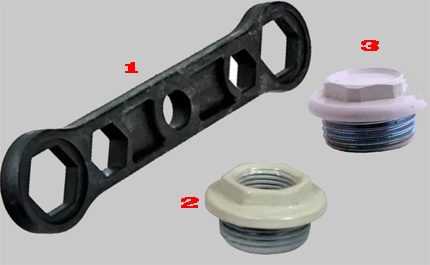 Ключ сантехнический накидной под установку радиаторных футорок и пробок. 1 – ключ накидной, 2 – футорка радиаторная, 3 – пробка радиаторная. С этим инструментом и деталями нередко оперируют при установке кранов, отводящих воздух
