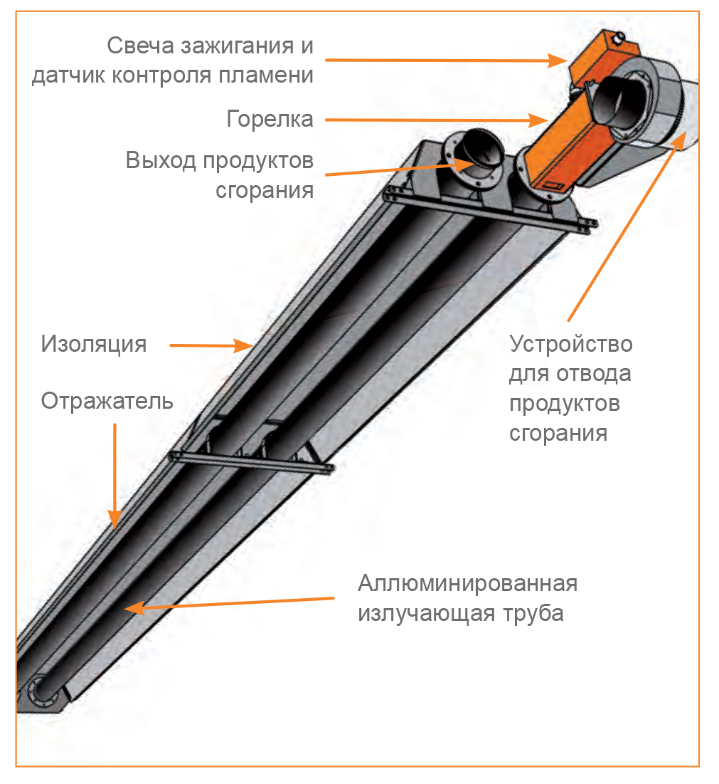 —Излучатель светлого типа с открытым горением и отводом продуктов горения в окружающую обогреватель среду.